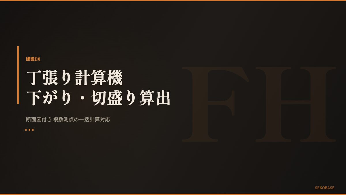 このツールを使えば、計画高・地盤高・天端高を入力するだけで、下がり・切盛り判定・法長・水平距離が一瞬で出る。SVGの断面図付きで視覚的にも確認できる。複数測点の一括計算にも対応。
