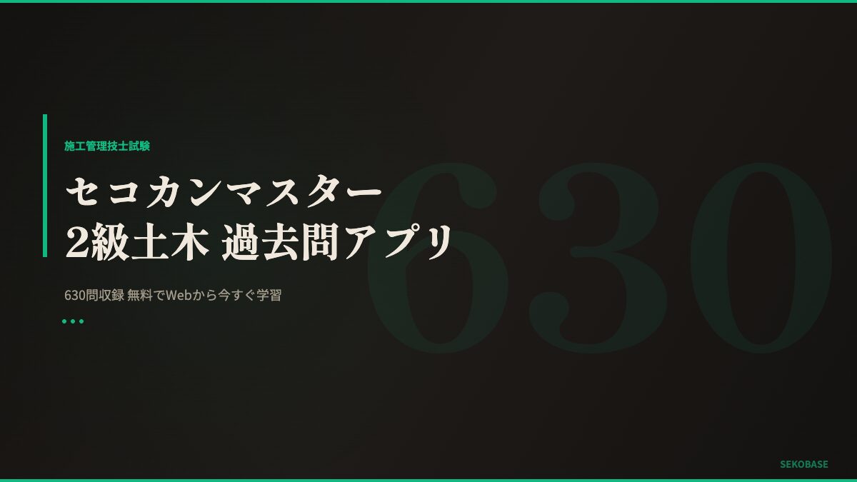 「セコカンマスター」は、令和3年〜令和7年の過去問全630問を収録したWeb学習アプリだ。インストール不要、ブラウザで開くだけ。現場の昼休みにポケットからスマホを出して、そのまま5問解ける。