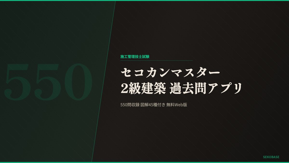 「セコカンマスター」は、令和2年〜令和7年の過去問全550問を収録したWeb学習アプリだ。インストール不要、ブラウザで開くだけ。現場の昼休みにポケットからスマホを出して、そのまま5問解ける。