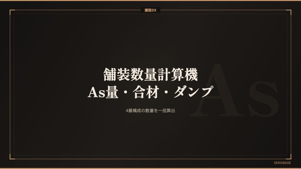 このツールを使えば、面積と各層の厚さを入力するだけで、層ごとの体積・合材量・ダンプ台数が一瞬で出る。表層・基層・上層路盤・下層路盤の4層に対応。プライムコート・タックコートの乳剤散布量も自動計算する。