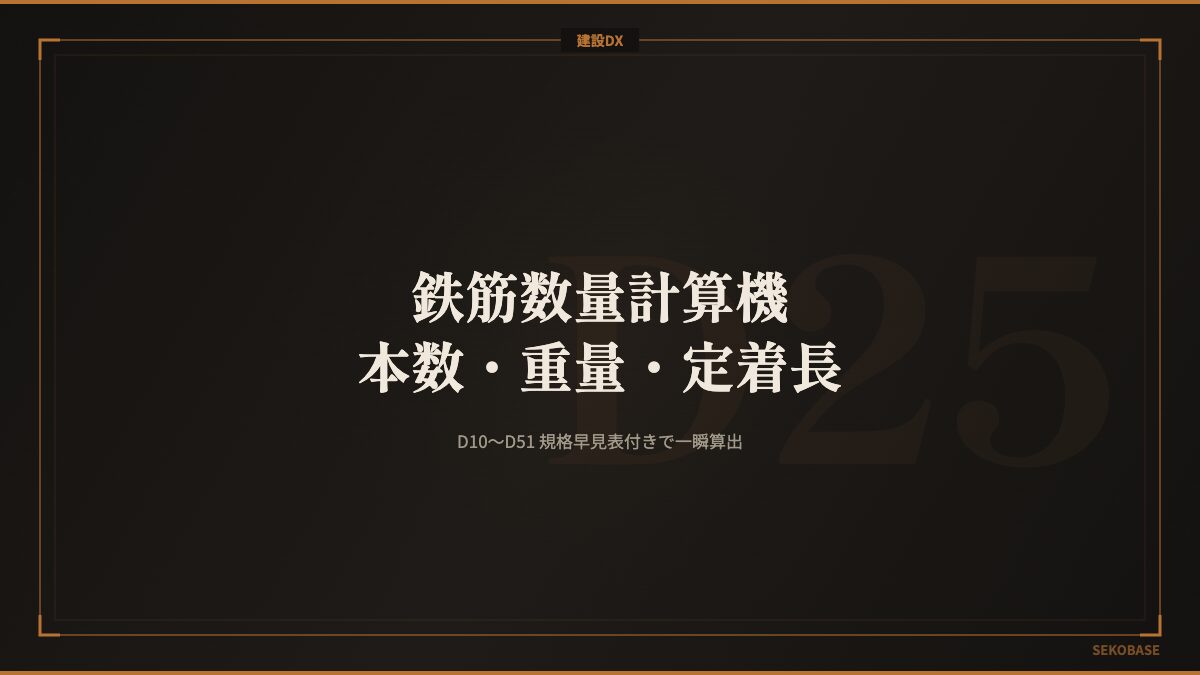 配筋ピッチから本数を出して、1本あたりの重量を掛けて、定着長を確認して、重ね継手長を調べて……。JISの規格表と首っ引きで計算する時間は、積もると結構バカにならない。
